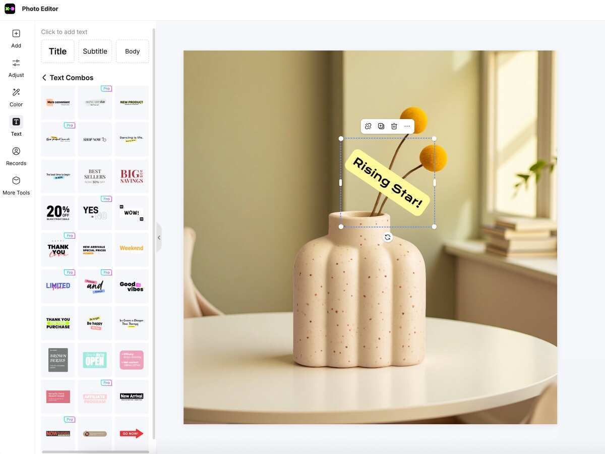 Quickly edit text on images with our AI image text editor. Customize text fonts, colors, and sizes to make your pictures look attractive. Perfect for creating visuals for e-commerce, gaming, posters, magazines, advertising, real estate and more. Whether you are correcting a little mistake or redesigning the text on the picture, this tool provides you with pro-level control without learning any skills. With different layout tools, you can create the best quality visuals in minutes.