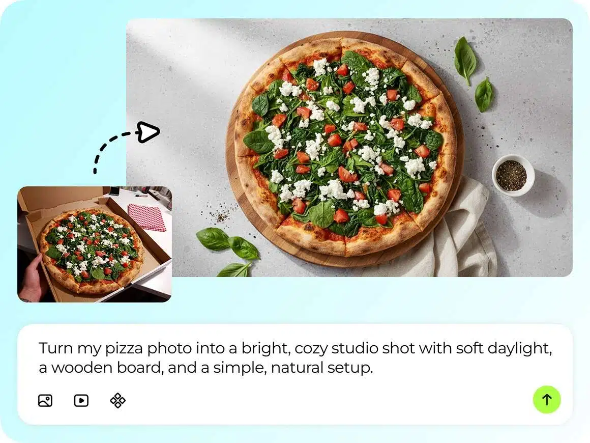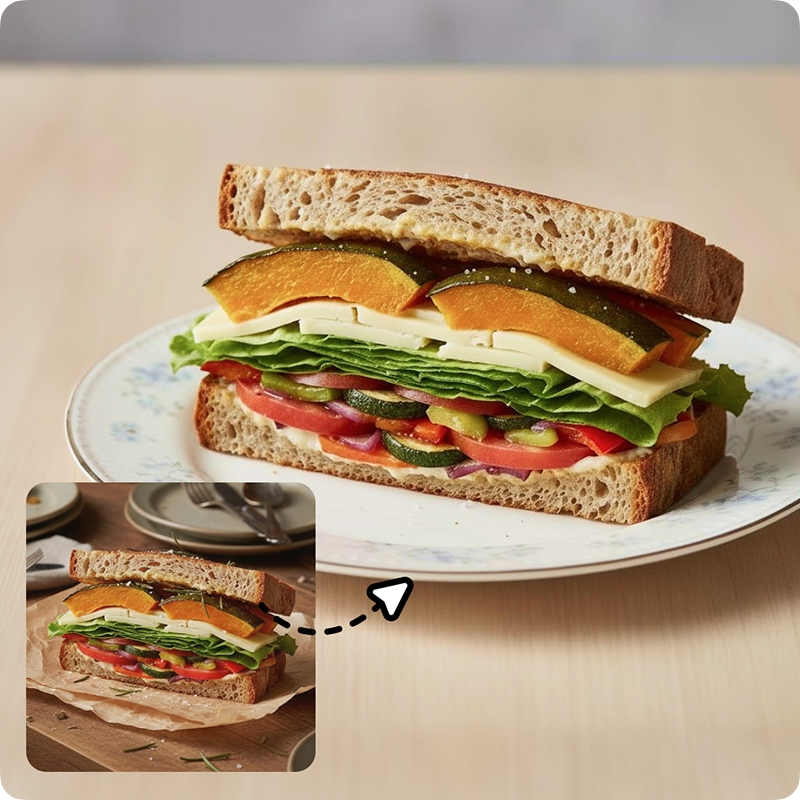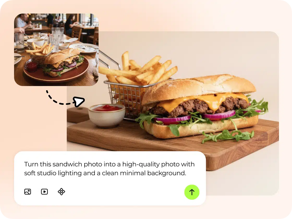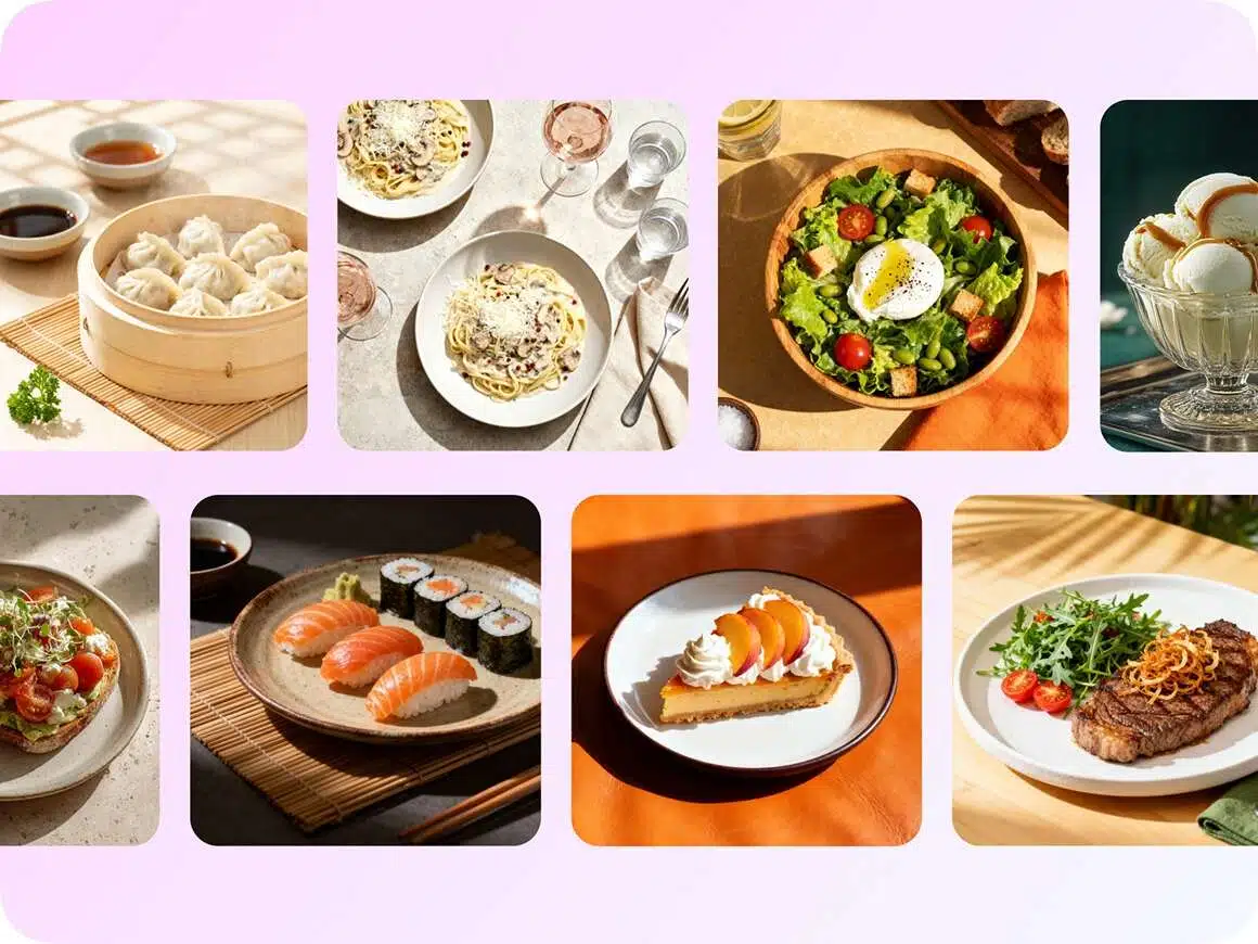 · Design Through Dialogue: Chat-Like AI Generation. Simply chat with the Agent to input your vision and instantly produce professional food photography.
