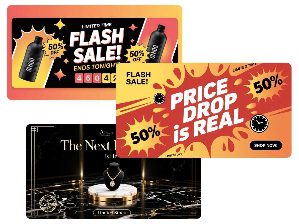 Online stores depend on visuals to sell. The AI helps you highlight new arrivals or festive promotions with banners that actually look like they belong in a professional storefront.