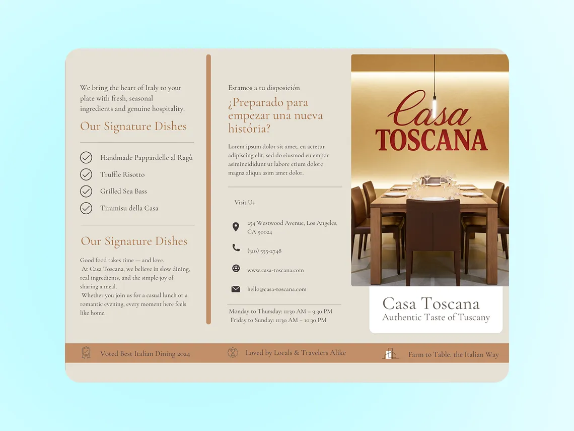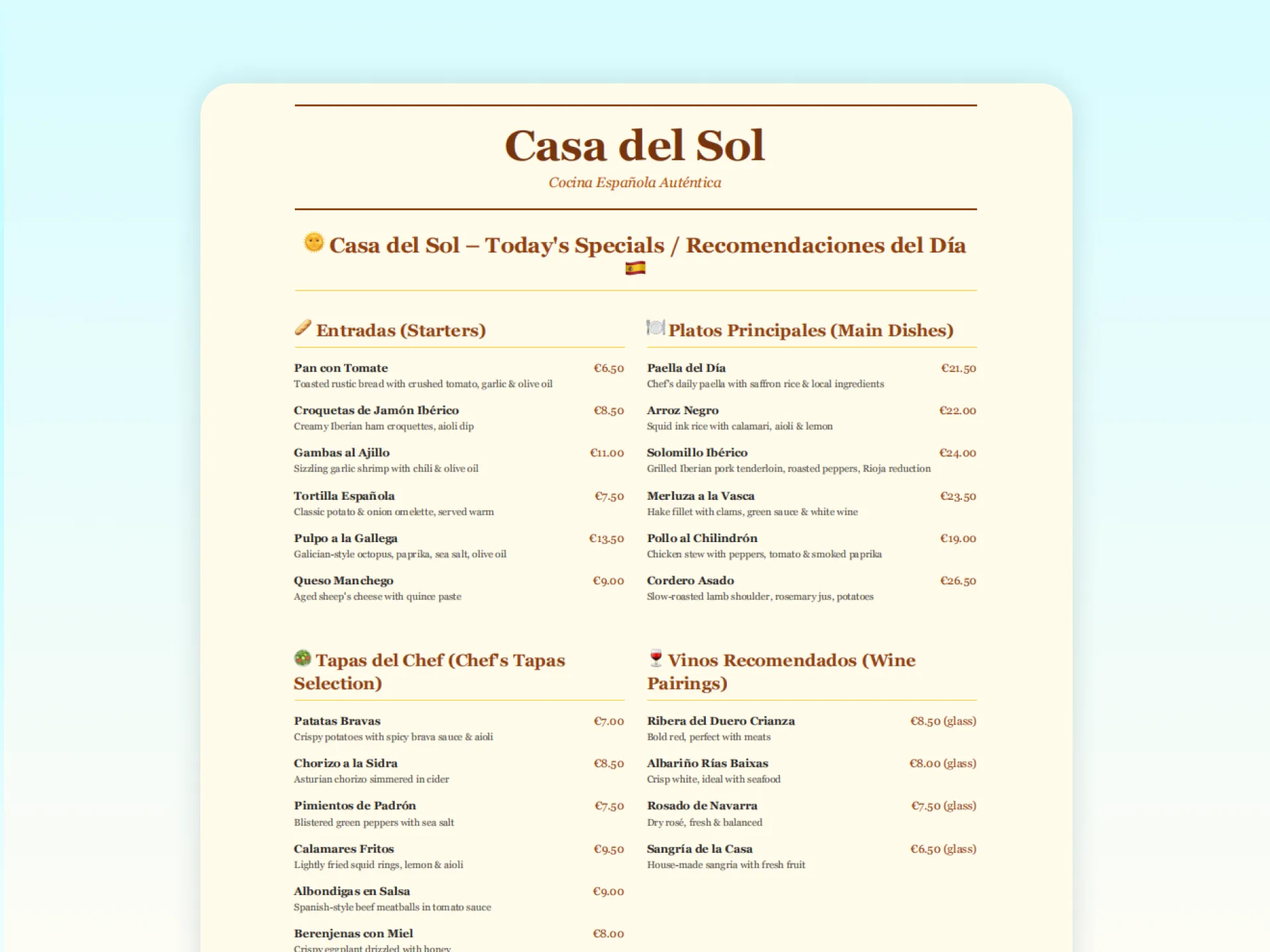 Generate a fully editable restaurant menu in English and Spanish with precise text rendering. Perfect for cafés, bistros, and casual dining spots looking to reach a global audience. Customize typography, layout, and dish descriptions in seconds, and export print-ready high-resolution assets.