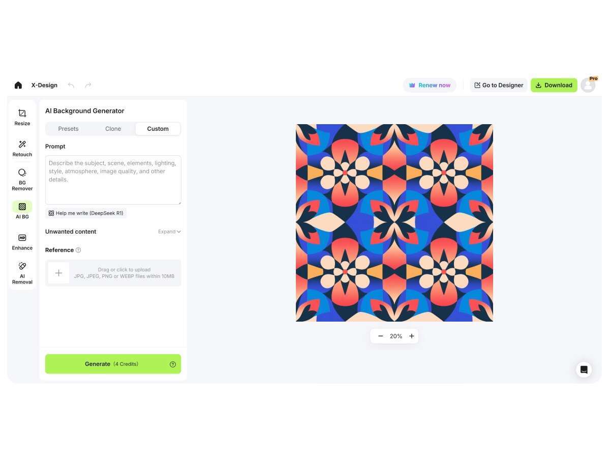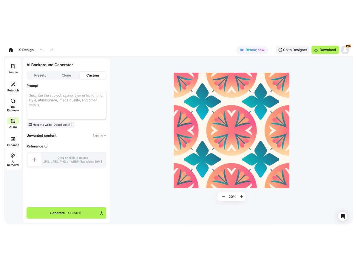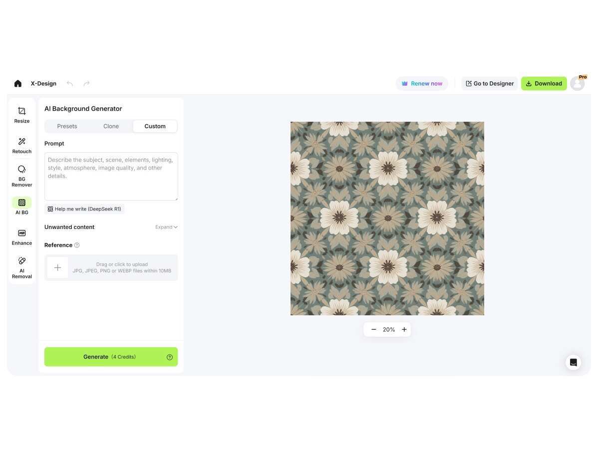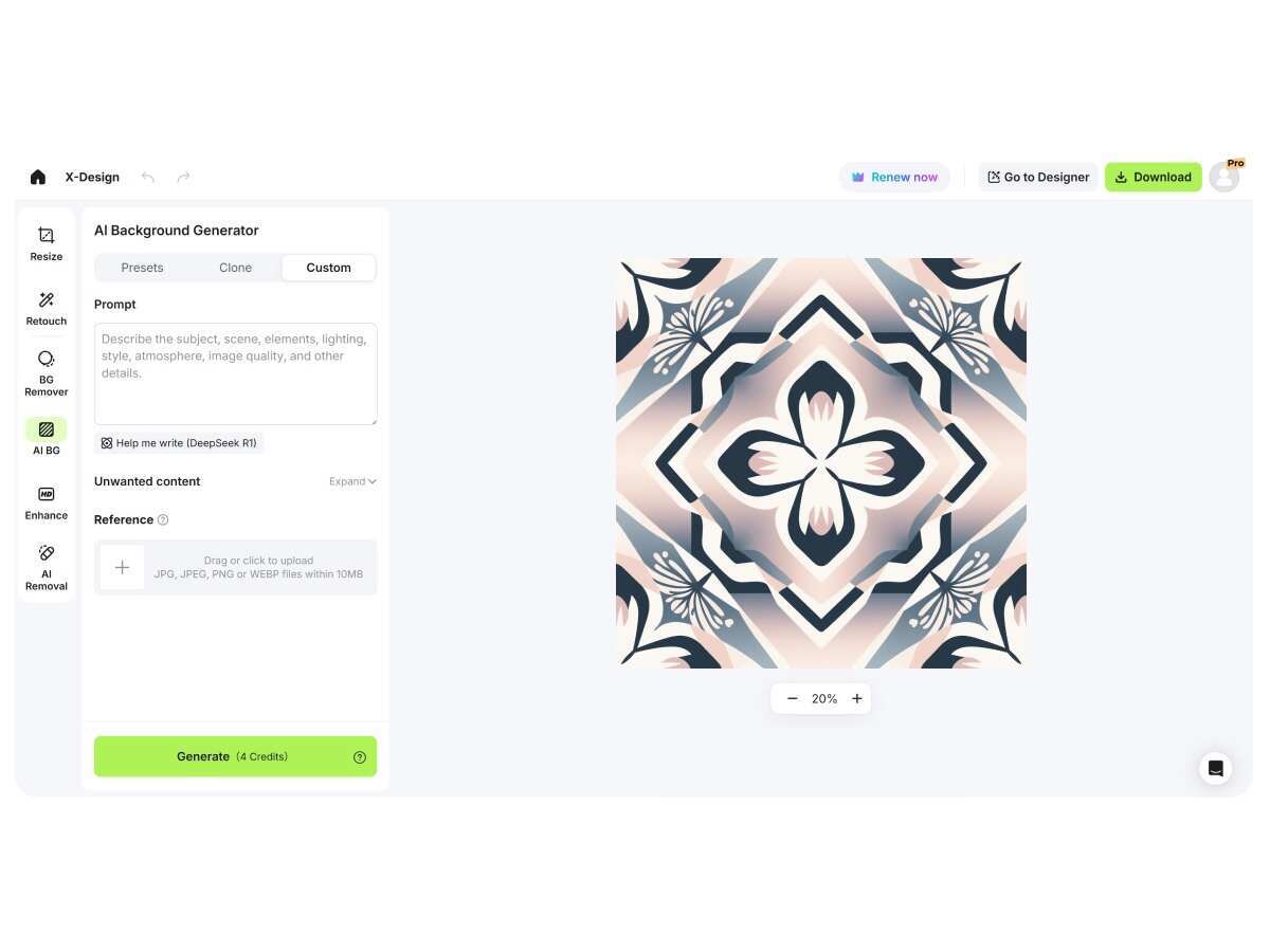 Next, choose the AI BG and then enter your requirements like generate pattern backgrounds under the custom feature. The tool will generate pattern backgrounds in seconds. You can also use the clone feature to create pattern background pictures effortlessly.
