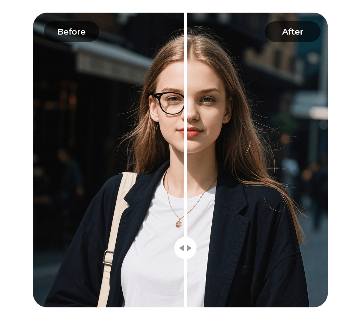 From thick frames to rimless glasses and clear lenses — our AI accurately identifies and removes them while preserving your facial details.