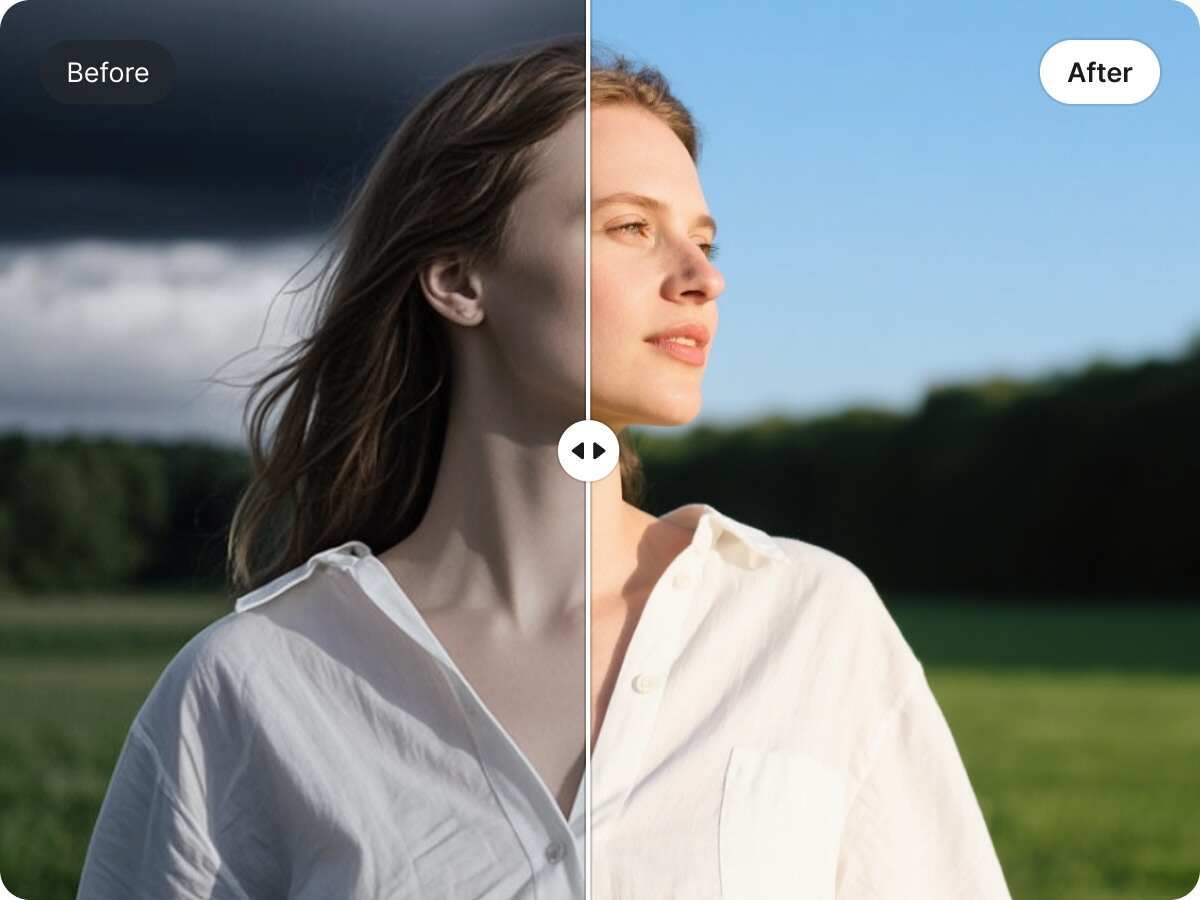Fix the Sky, Not the Scene: Bad lighting? Gloomy skies? Keep your subject, just change sky background in photo to match your vibe.